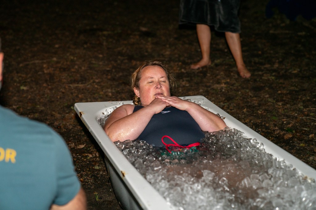 One thing I learnt last weekend was that baths are deceptively large. Walking into the woodland to see two baths sat waiting, getting filled with ice and a small amount of cold water. Looking at them they didn’t look like something that I’d be able to near enough fully submerge in. In the case of most others – they didn’t. Longer legs meant knees were out in the open air. My short legs fitted no problem unfortunately!