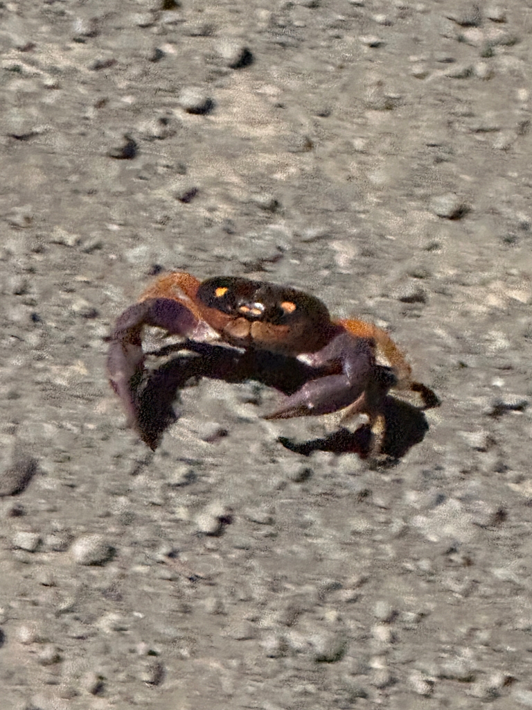 Crab rescue – crabs are extraordinary beings. Without looking at a weather forecast they know when the rainy season is about to start here in Costa Rica. Just before the rains come, land crabs make their annual migration from their inland burrows to the beaches to lay their eggs. Once upon a time that was fine. There were no roads. Now many get killed by passing vehicles, never making it to the beach. I’ve spent a couple of evenings here in Montezuma giving as many as I can a helping hand across the road – ensuring that at least some make it to start the next generation.
